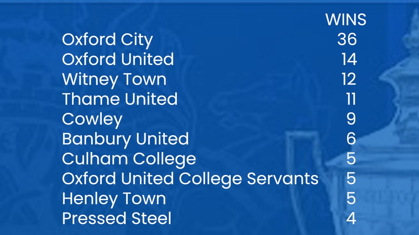 The best run of Cup Final wins is six by Oxford City between 1966 and 1971 (though they shared the Cup in 1970-71). Cowley (1921 to 1924) and Oxford United (1988 to 1991) have had runs of four successive victories.